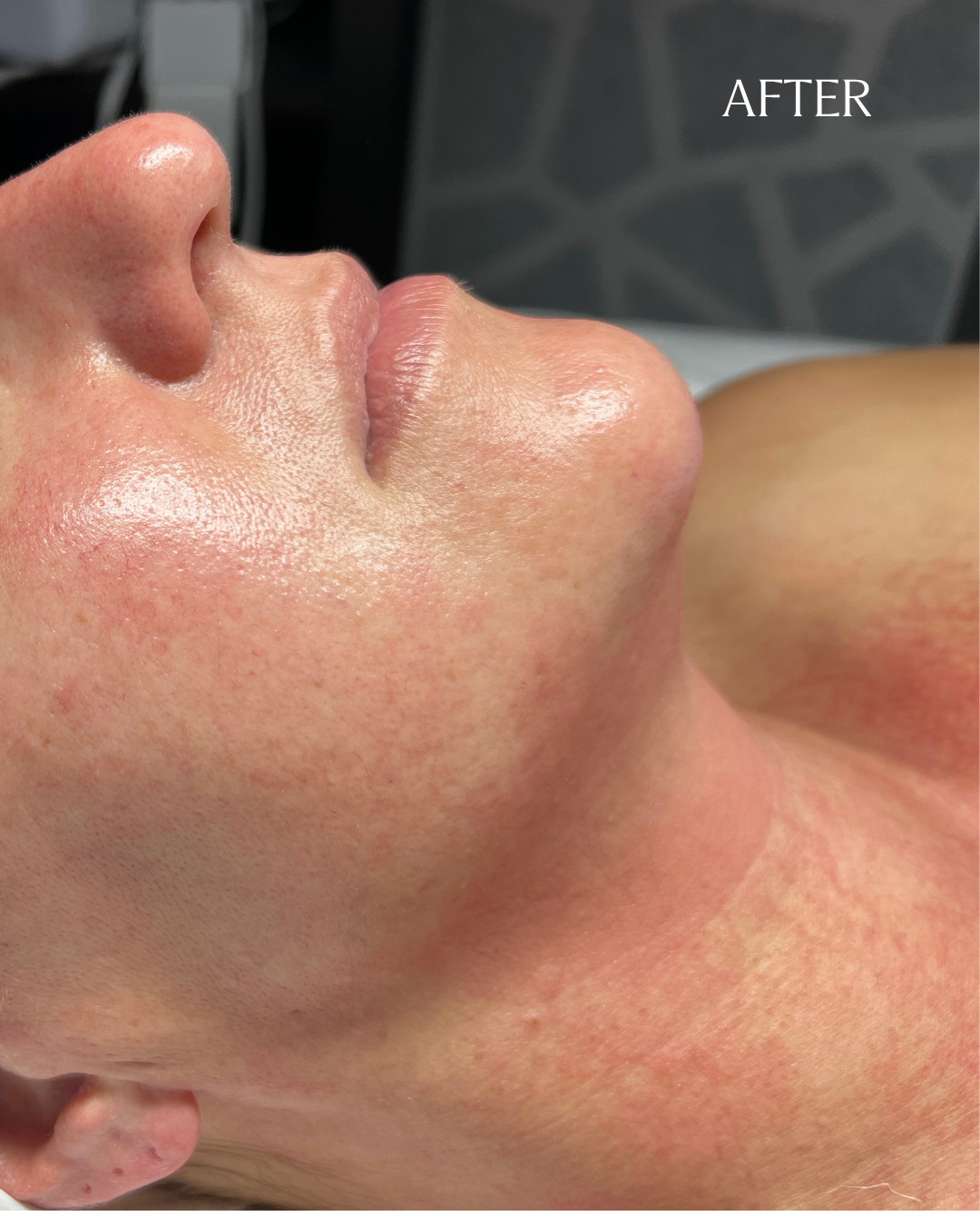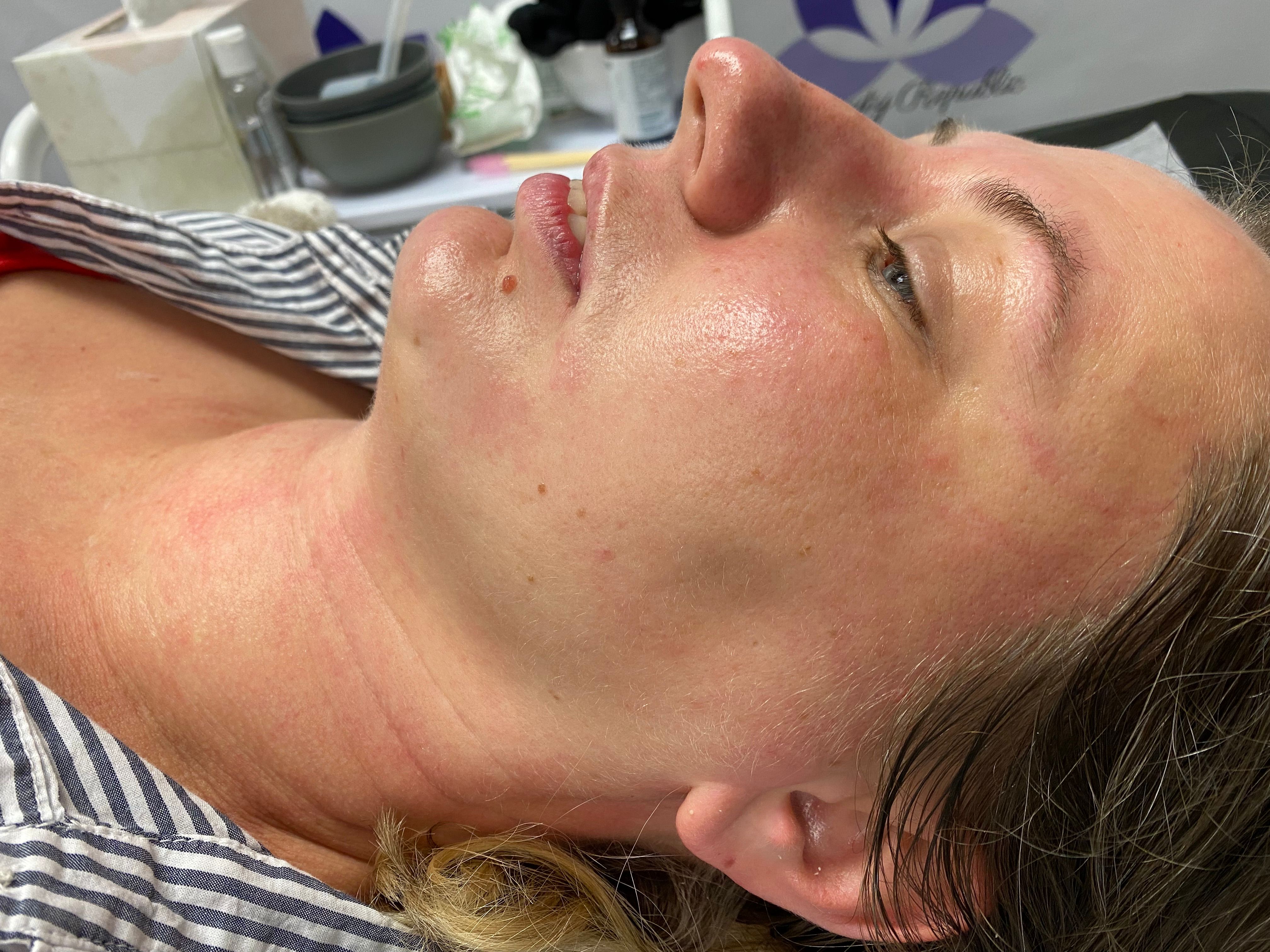 The mask will be removed with soft brushes, cleanser, sponges, and hot towels. You will feel tightening and toning immediately. A lot of times, the mask encourages a plasmatic effect - tiny red lines over your neck and face. Sometimes, it takes multiple treatments to see this effect if there is a lot of dead cell material and poor circulation.