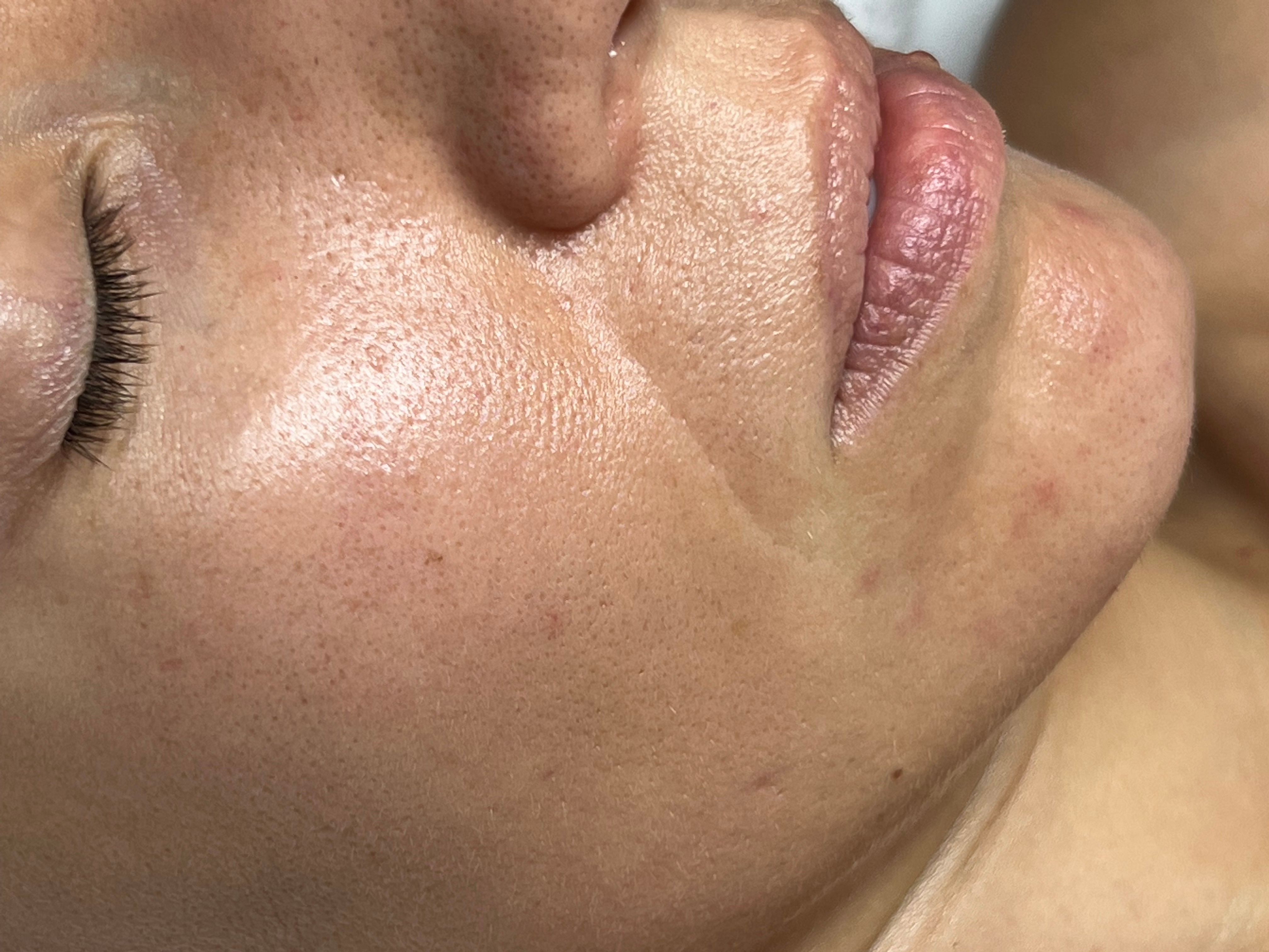 We will pat dry your skin, open a new sterile blade and proceed with a treatment. We will angle the blade at 45°, hold the skin taut, and gently scrape off dead skin cells and vellus hair. Some areas may require an additional pass if we work on skin complexion or scarring.